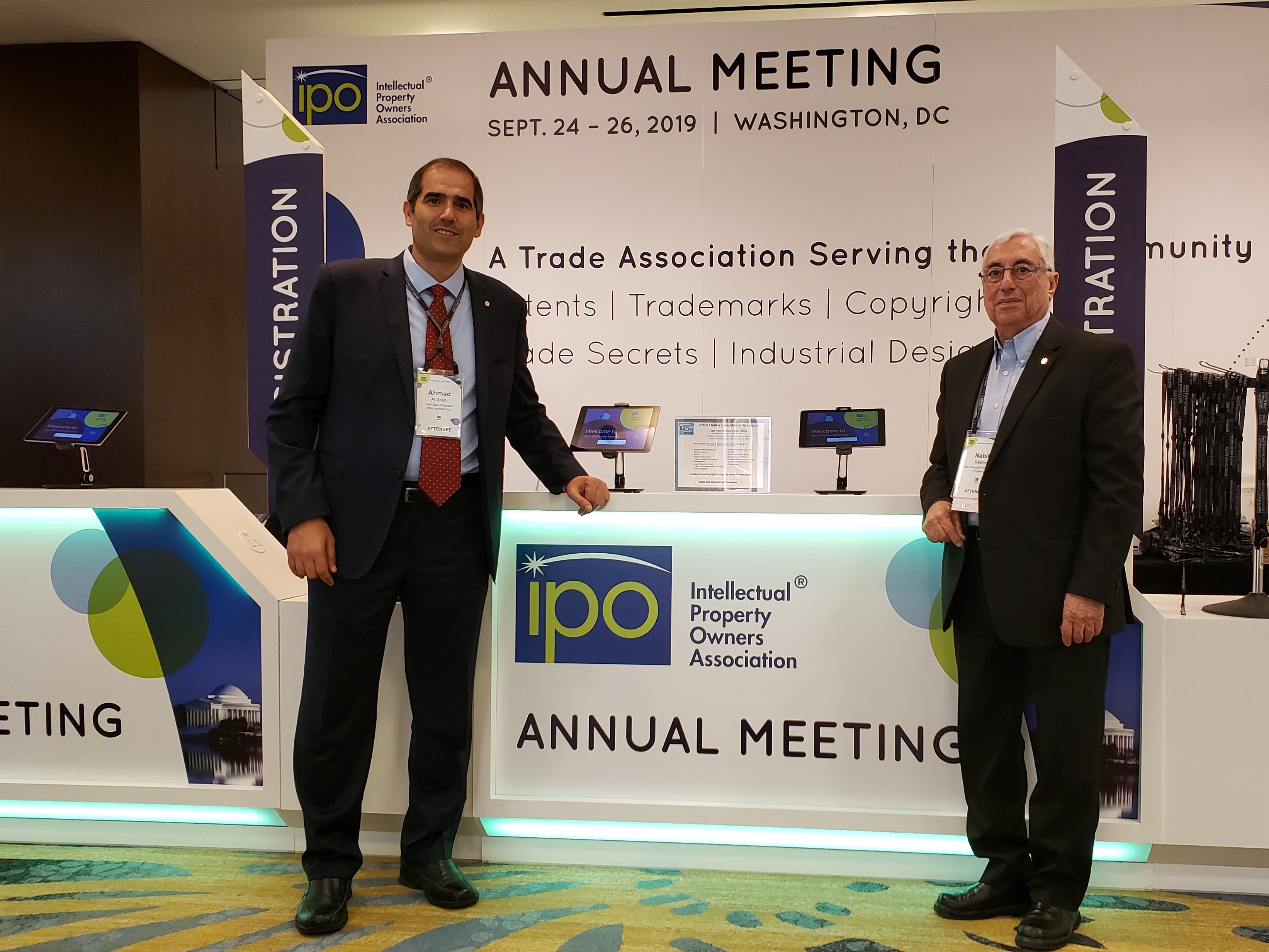 Abu-Ghazaleh Intellectual Property (AGIP), represented by its Vice-President Marketing and Executive Director, Mr. Nabil Salamé, and Executive Director at Talal Abu-Ghazaleh International Inc., Mr. Ahmad Al-Zoubi, participated in the Intellectual Property Owners Association (IPO) 2019 Annual Meeting, which took place in Washington D.C.....